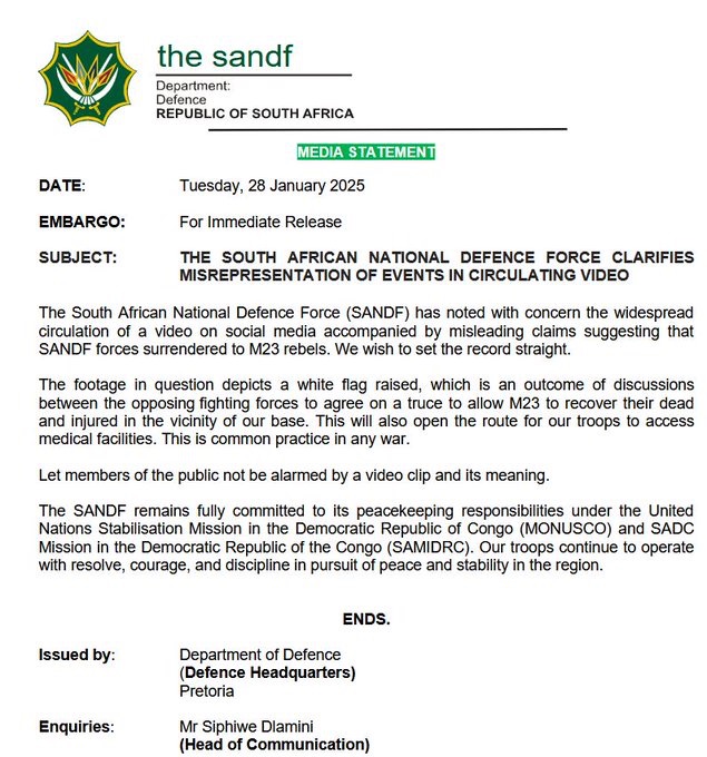 The South African National Defense Force has a peacekeeping detachment in the city. They released a video which shows a white flag above their compound. They say it represents a pause in the fighting so the dead can be collected and not a surrender.
