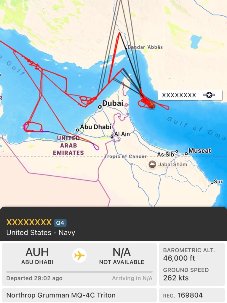 Working alongside the F/A-18’s were at least two of the EA-18G Growlers Electronic Warfare aircraft which went into an orbit a couple hundred miles north of the Gulf. Grizzly 1 and Grizzly 2 are the call signs.