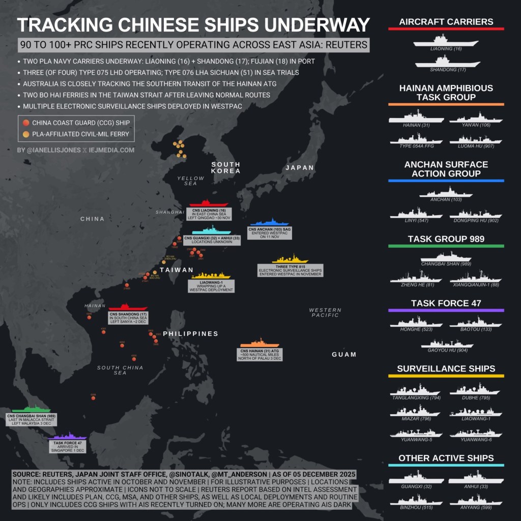 According to Adm. David Johnson, chief of Australia’s defense force “We are aware the task group is composed of four ships, a Yushen landing helicopter dock assault, a Renhai-class cruiser, a Jiangkai-class frigate and Fuchi-class replenishment vessel, an Australian P-8 observed the task group on the evening of the second of December in the Philippine Sea, approximately 500 nautical miles north of Palau,”