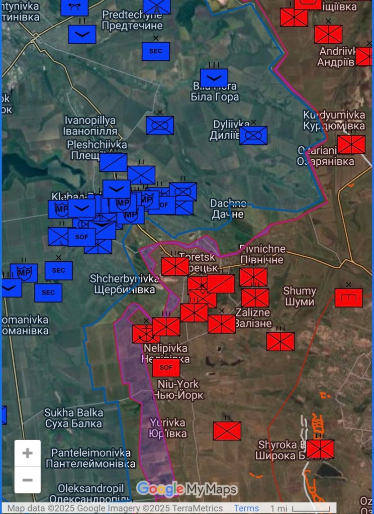 Toretsk sits North of Dontesk city and Avdiivka and south of the former fortress town of Chasiv Yar. While Russia has claimed to control the city Ukrainian forces are still contesting it daily. In fact a sort of who can keep their flag up the longest contest has broken out between the two sides.