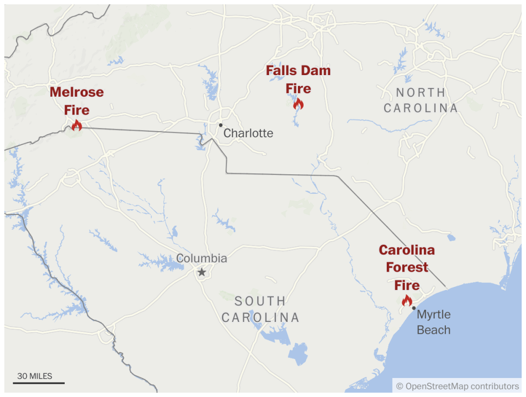 The ongoing fires have burned over 4000 acres over the weekend and continued into Monday. South Carolina governor Henry McMasters issued some localized evacuation orders as well as a state of emergency allowing for federal funds and resources to be made available although I don’t have specifics for that as of yet.