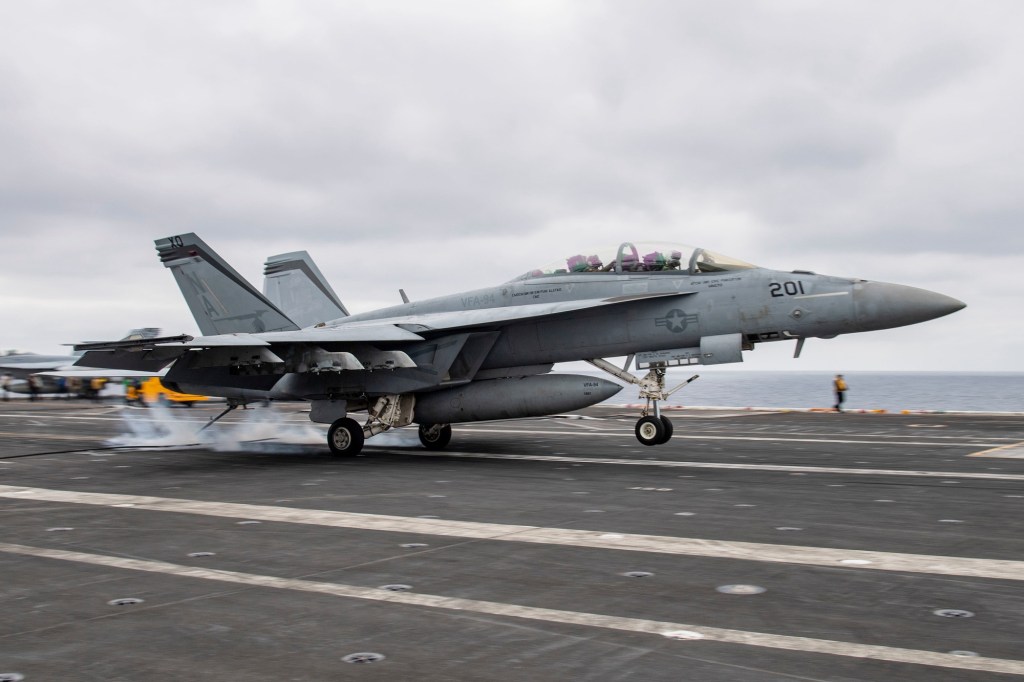 The Ford has yet to undergo its refit which will allow it to launch the F-35C’s so its combat air wing is made up entirely of Super Hornets.