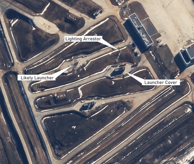 Decker Eveleth, an analyst with the CNA research and analysis organization found this satellite imagery and identified at least 9 horizontal launch pads under construction. The launch platforms are in three groups located inside a high berm to shield them from direct attacks. The high berm surrounding the groups also protects in case of accidental explosion from destroying or detonating the other missiles and launchers. The site shows what Decker believes to be lightning rods to protect the large metal equipment from Mother Nature.