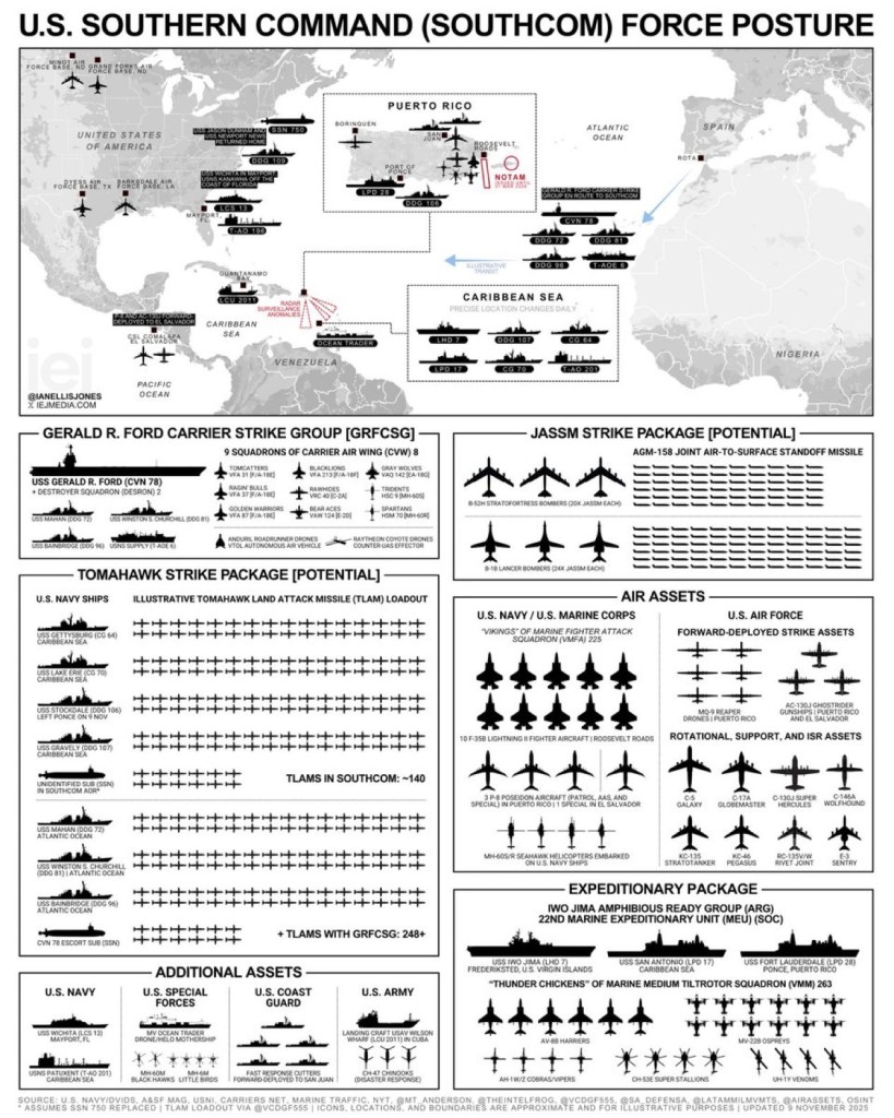 Today the USS Gerold R.Ford (CVN-78) , a Ford-Class nuclear powered aircraft carrier, has entered the waters of the Caribbean, joining the fourth fleet and coming under the command of US SOUTHCOM(Southern Command). The Ford, its escorts and its Carrier Air Wing are just the most recent additions in a large military buildup, adding to the tensions in the region.