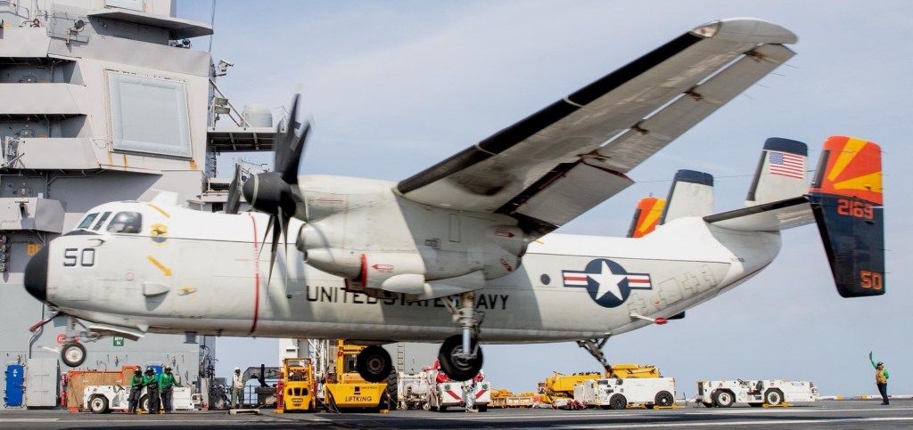 F/A-18F Pilot LCDR Jamie R. Struck the makes first carrier arrested landing using AAG system aboard USS Gerald R. Ford (CVN-78) off the Virginia coast. US Navy PhotoEA-18G Growler with Electronic Attack Squadron 142E-2D Advanced Hawkeye Two Carrier Air Wing 8 MH-60S Sea Hawks, attached to Helicopter Sea Combat Squadron 9, fly in formation over the world’s largest aircraft carrier, USS Gerald R. Ford (CVN 78), during an aerial change of commandCarrier Onboard Delivery C-2A Greyhound.