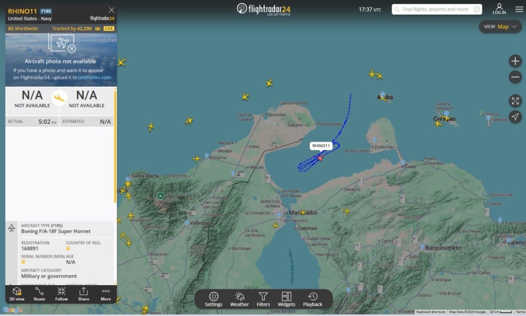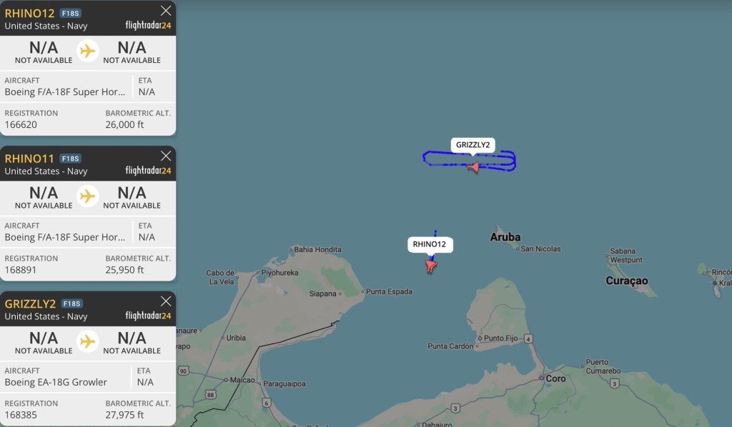 Image from FlightRadar24 showing the two F/A-18 Super Hornets in the Gulf of Venezuela. Call signs- RHINO11 and RHINO12.