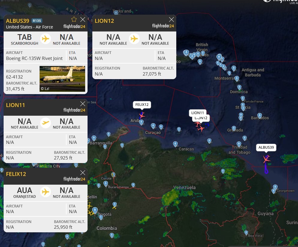 Flightradar24 showing an RC-135 Rivet Joint and several unknown aircraft operating off the coast of Venezuela.