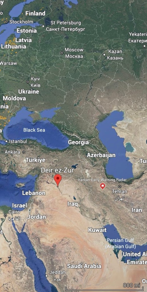Following the path back from Tehran over the radar site and past Iraq puts us in Deir ez-Zor,Syria where Israeli jets were filmed refueling from their Boeing 707 tanker jets.