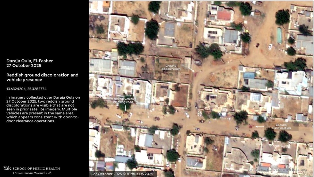 Satellite images which were studied and released by the Yale School for Public Health show the city and imply that the RSF went house to house interrogating and killing civilians. Red blotches can be seen in the sand which seem to indicate large pools of blood had been spilled there, some clusters of objects are believed to show where the bodies have been left on the ground, in the groups they were killed with.