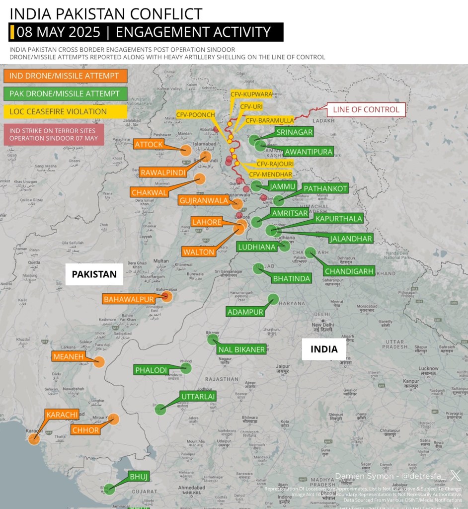 Today (May 8th), has seen the continuation of violence as Pakistan responded to yesterday’s missile attack with a round of artillery and a drone attack stretching across several regions of India across much of the border region, as shown in the map below.