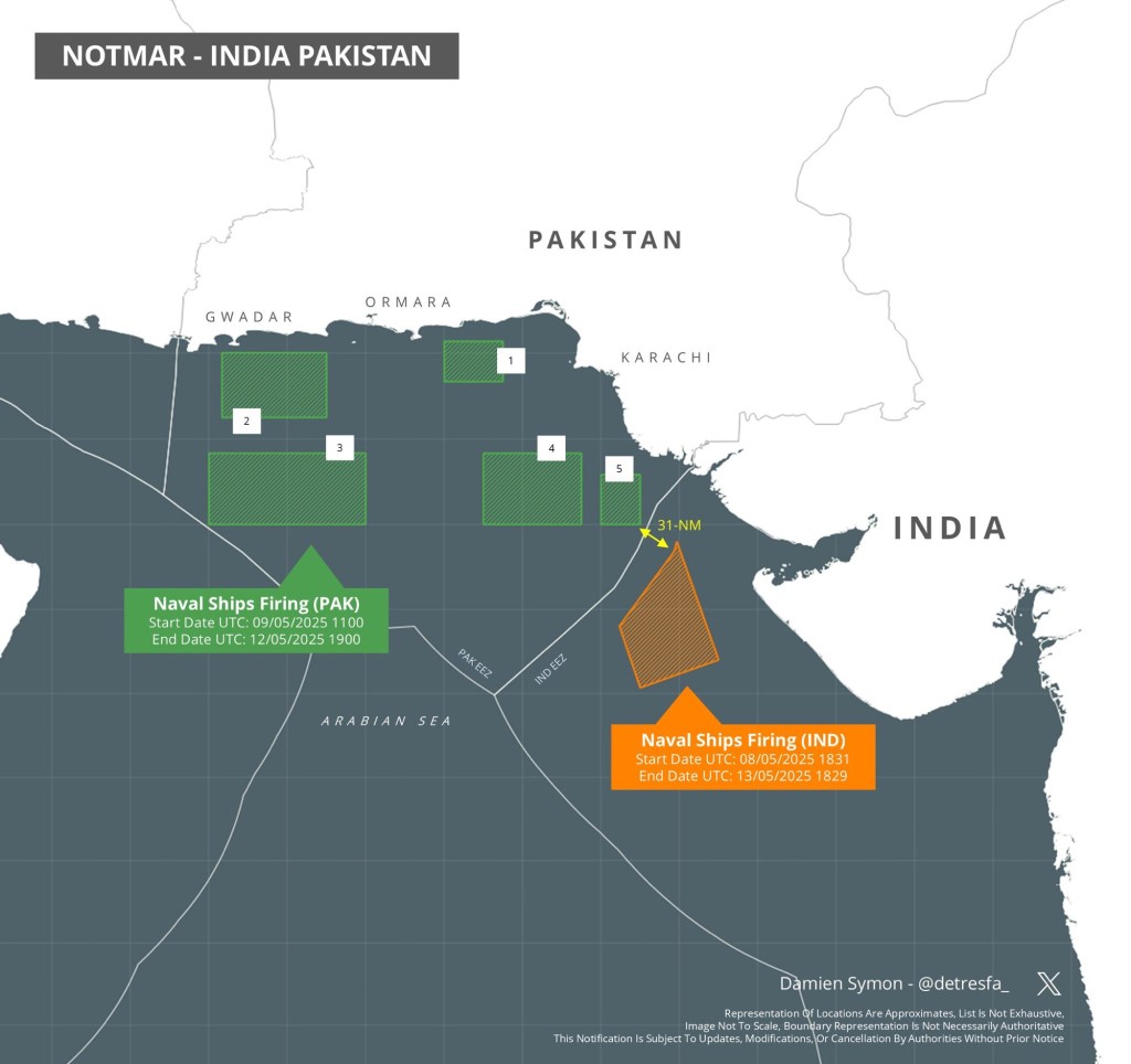 Both the Pakistan and Indian Navy’s issues NOTMAR’s (Notice to Mariners) warning maritime traffic of simultaneous navel weapons firing.